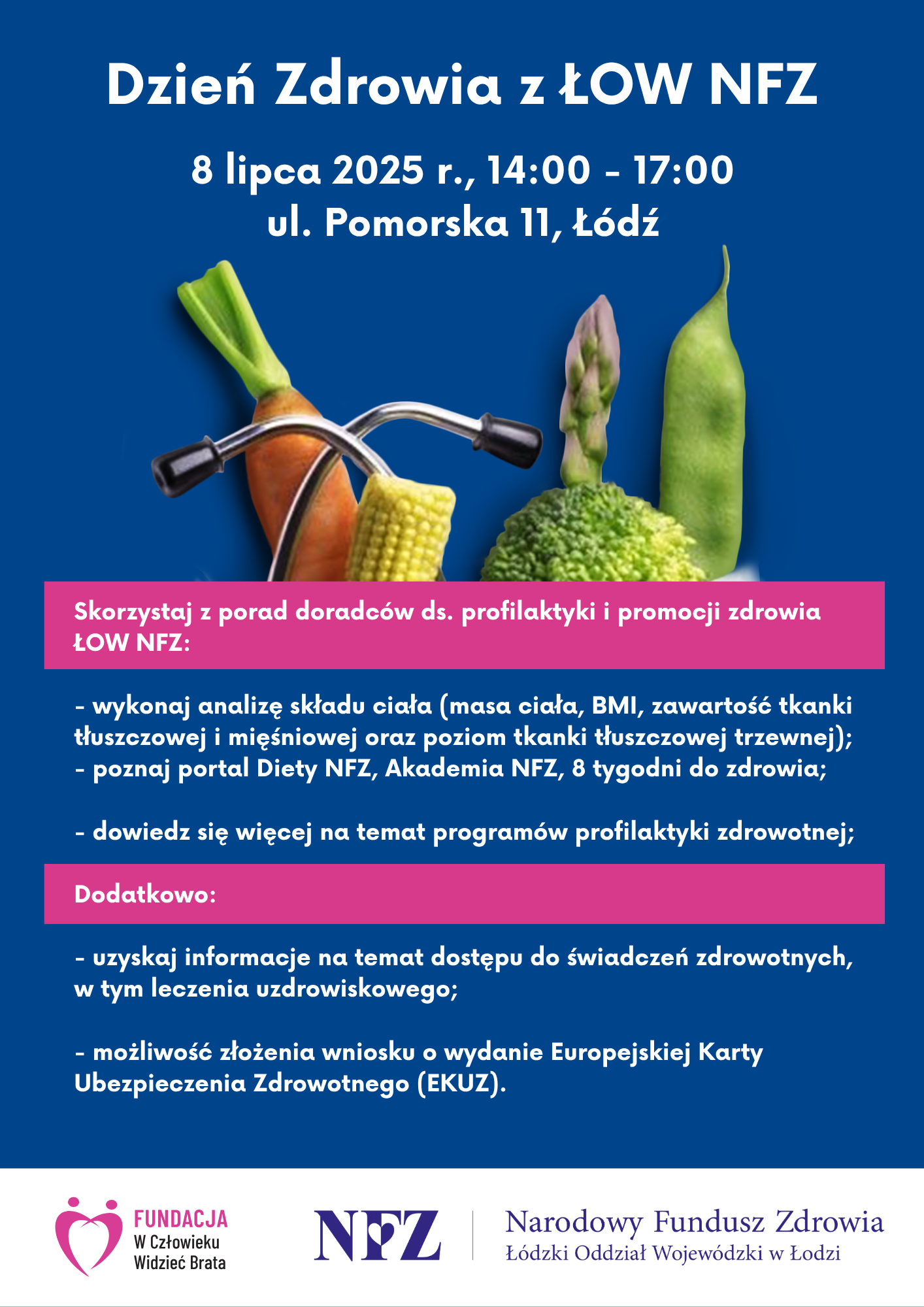 Serdecznie zapraszamy 8 lipca 2025 roku w godzinach 14:00-17:00 do udziału w wydarzeniu „Dzień Zdrowia z ŁOW NFZ”, który odbędzie się w Łodzi przy ul. Pomorskiej 11.