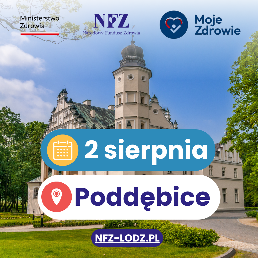 W najbliższą sobotę 2 sierpnia 2025 r. Łódzki Oddział Wojewódzki NFZ oraz Ministerstwo Zdrowia wraz z partnerami zapraszają do pięknych Poddębic! Zapraszamy od godz. 9 do 12 na Plac Kościuszki w Poddębicach.