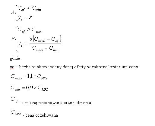 Jednocześnie informujemy, że cena jest jednym z kryteriów oceny ofert i oceniana jest poprzez odniesienie ceny jednostki rozliczeniowej zaproponowanej przez oferenta w ofercie lub stanowiącej końcowy wynik negocjacji w stosunku do ceny oczekiwanej przez Narodowy Fundusz Zdrowia w danym postępowaniu w sprawie zawarcia umowy. Zgodnie ze wzorem zawartym w załączniku nr 2 do Zarządzenia Prezesa Narodowego Funduszu Zdrowia z dnia 16 października 2008 r. za propozycję cenową na poziomie ceny oczekiwanej można uzyskać maksymalnie 15 punktów, za propozycję cenową na poziomie ceny minimalnej można uzyskać 30 punktów, a za propozycję cenową równą cenie maksymalnej oferenci nie uzyskają punktów w ww. kryterium oceny. Przekroczenie cen maksymalnych powoduje naliczenie ujemnych punktów w kryterium cena.