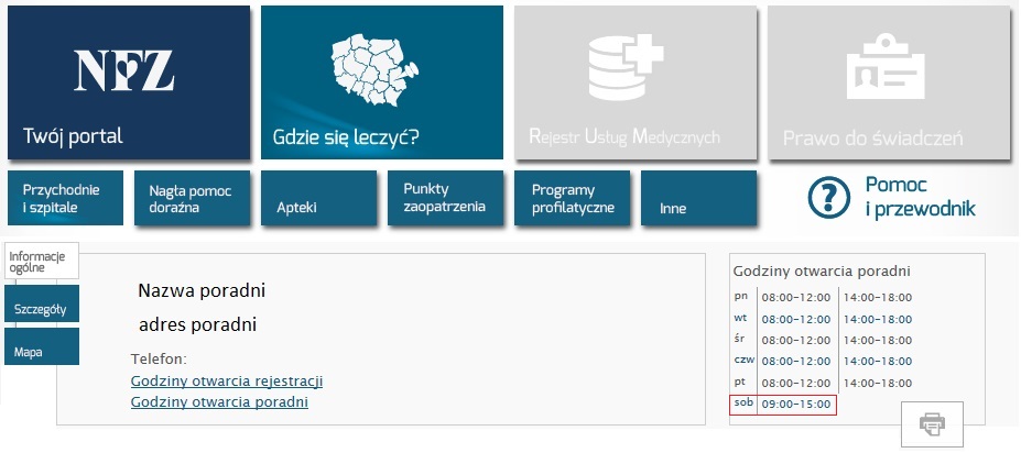 W Zintegrowanym Informatorze Pacjenta, w zakładce Gdzie się leczyć obok każdej poradni znajdują się godziny jej otwarcia. Ponadto każda poradnia ma obowiązek w widocznym miejscu umieścić godziny pracy lekarza.