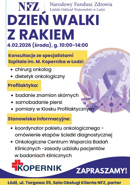Zapraszamy 4 lutego 2026 roku w godzinach 10:00- 14:00 na wyjątkowo ważne wydarzenie - Dzień Walki z Rakiem, które odbędzie się na Sali Obsługi Klientów NFZ przy ul. Targowej 35 w Łodzi.
