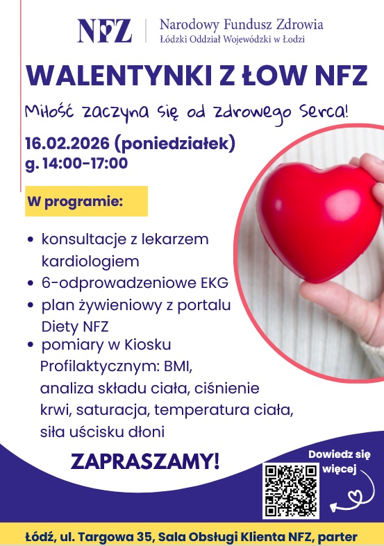 Zapraszamy 16 lutego 2026 roku w godzinach 14:00- 17:00 na wyjątkowe wydarzenie - Walentynki z ŁOW NFZ, które odbędzie się na Sali Obsługi Klientów NFZ przy ul. Targowej 35 w Łodzi.