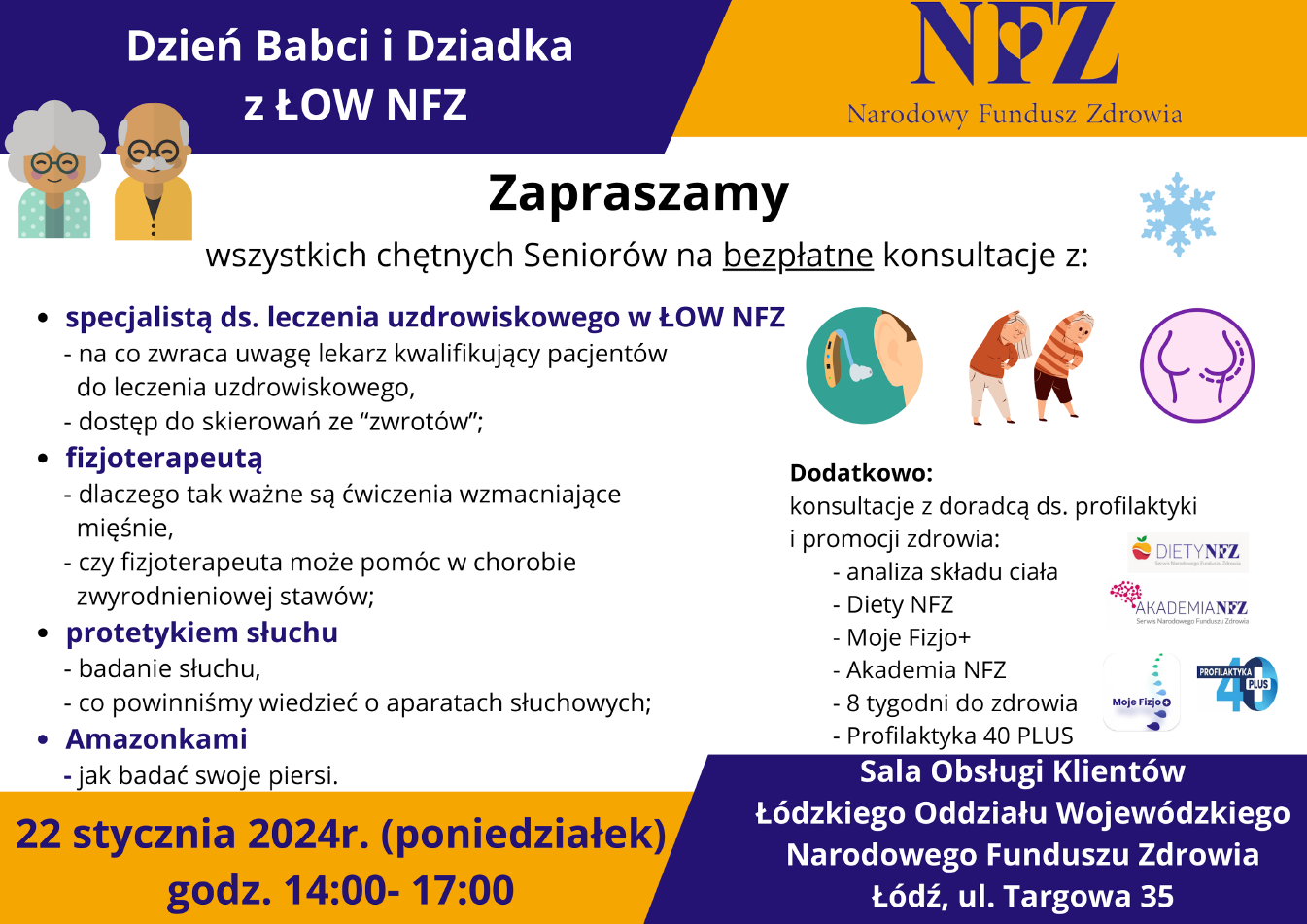 Łódzki Oddział Wojewódzki Narodowego Funduszu Zdrowia zaprasza wszystkich do udziału w obchodach Dnia Babci i Dziadka w siedzibie ŁOW NFZ przy ul. Targowej 35 w Łodzi.